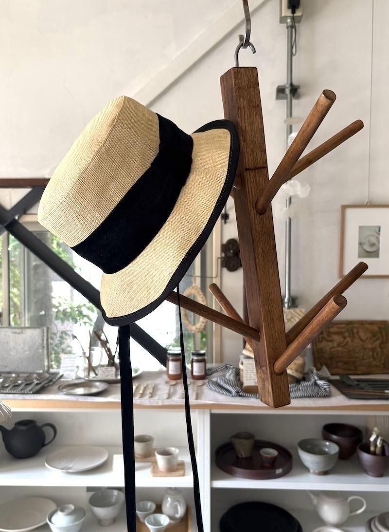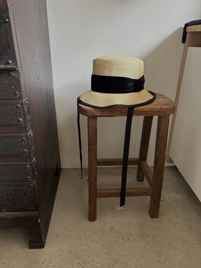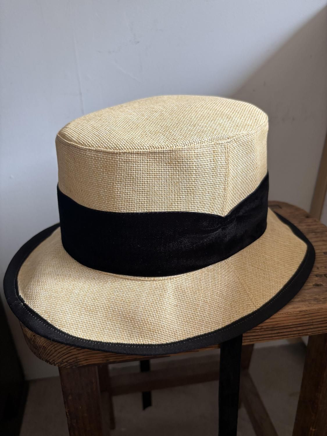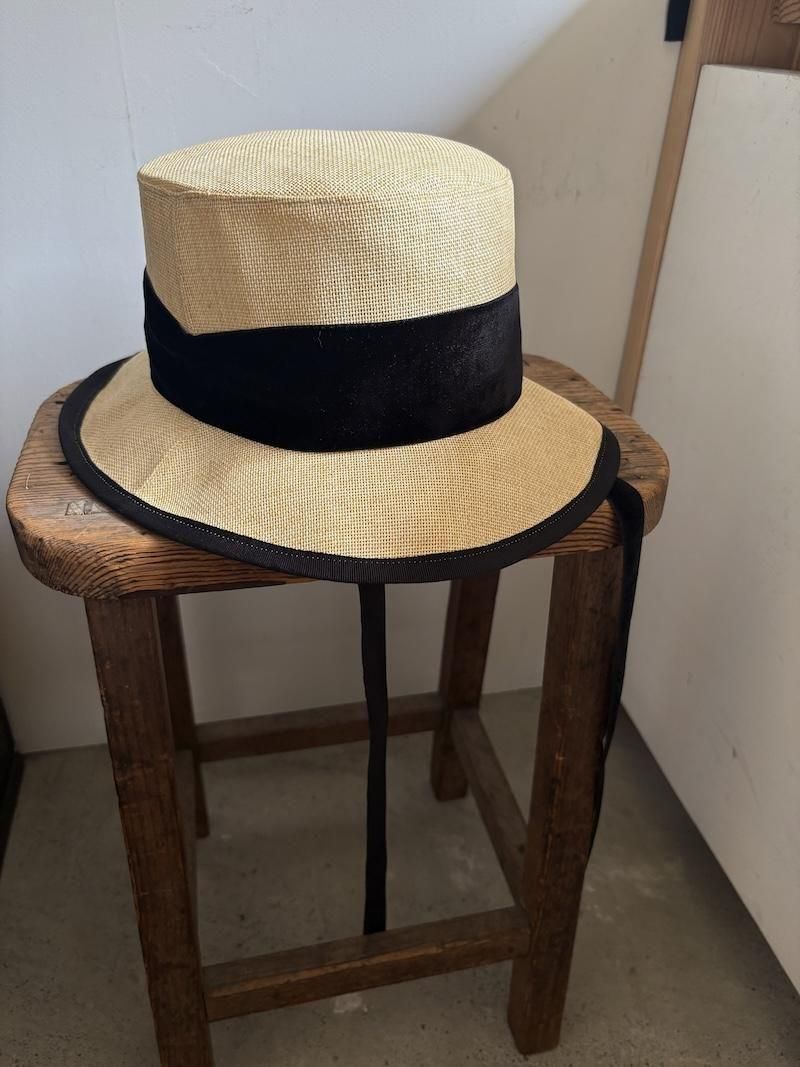 木と根 の特別オーダーとしまして、縁に黒いトリミングが施されたカンカン帽のようなスタイルの小さめツバの帽体に、幅の広めなベロアリボンをぐるりと施しました。