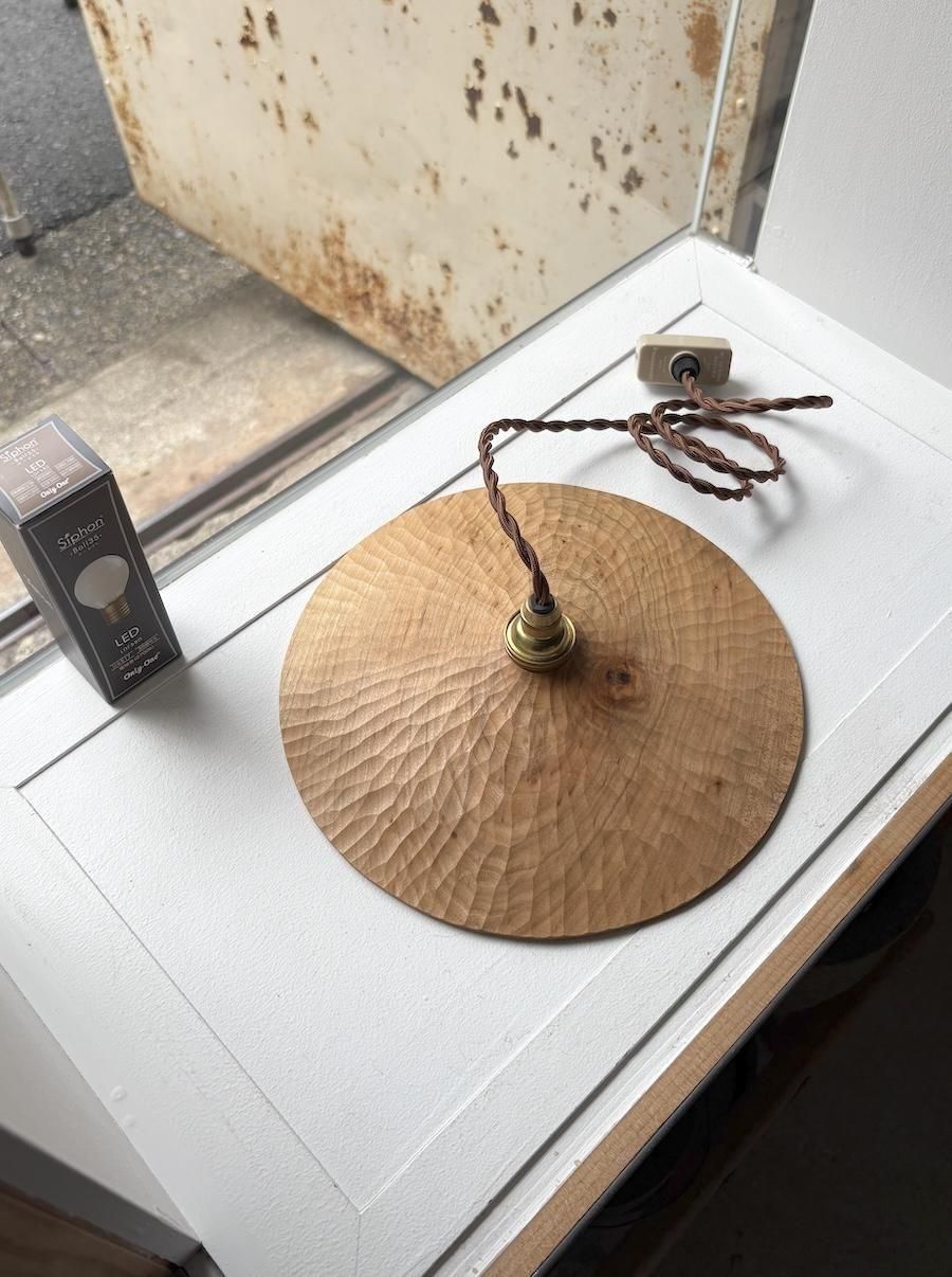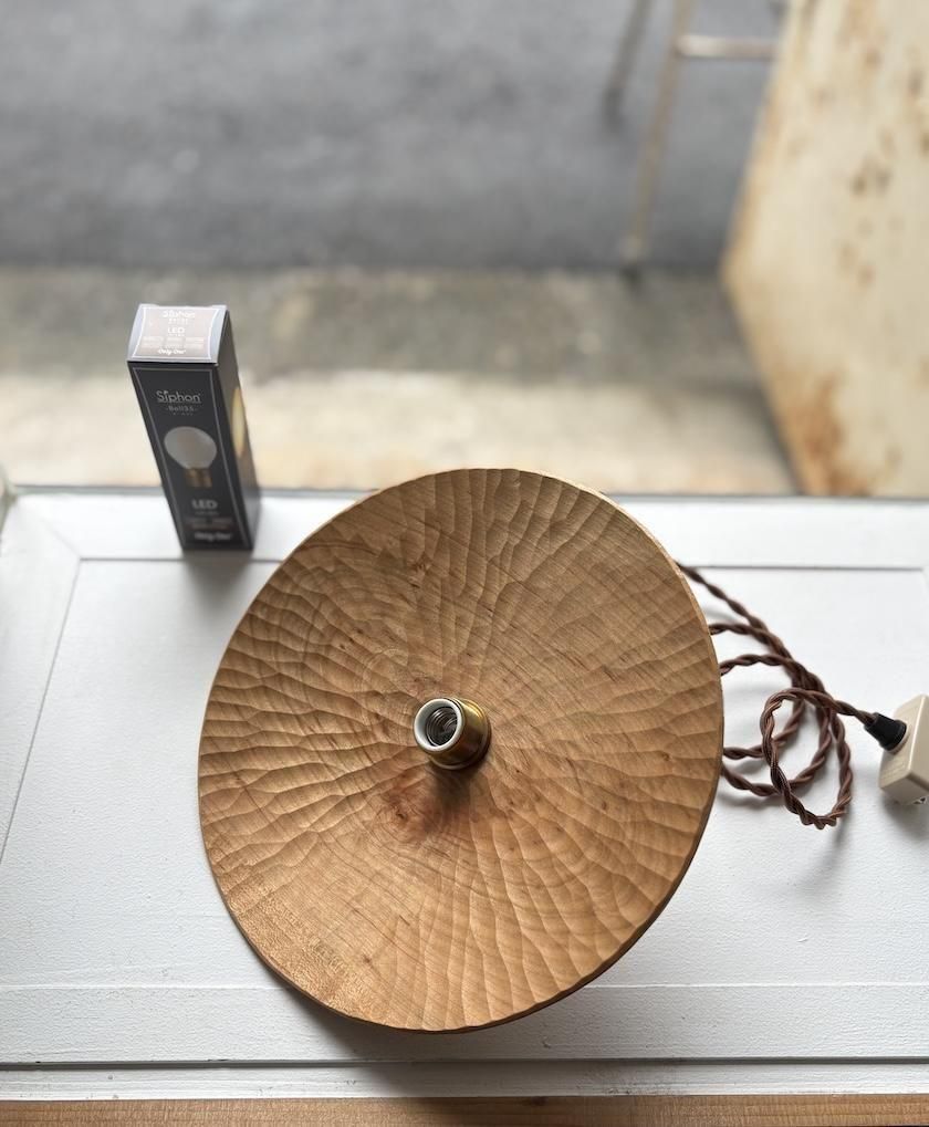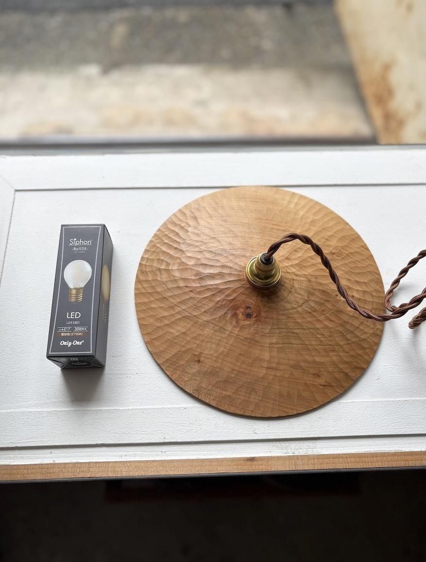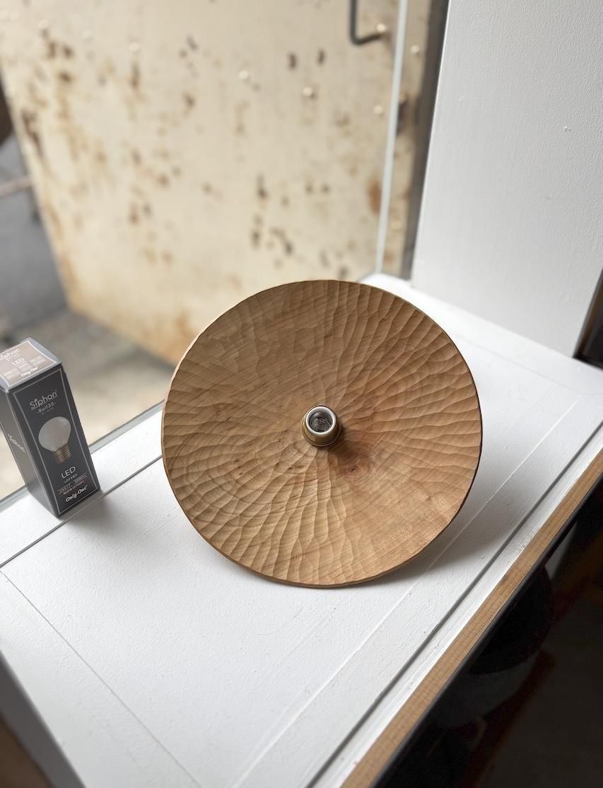 当店の喫茶室や店内にて長らく愛用しております渡邊さんの木のランプシェード。